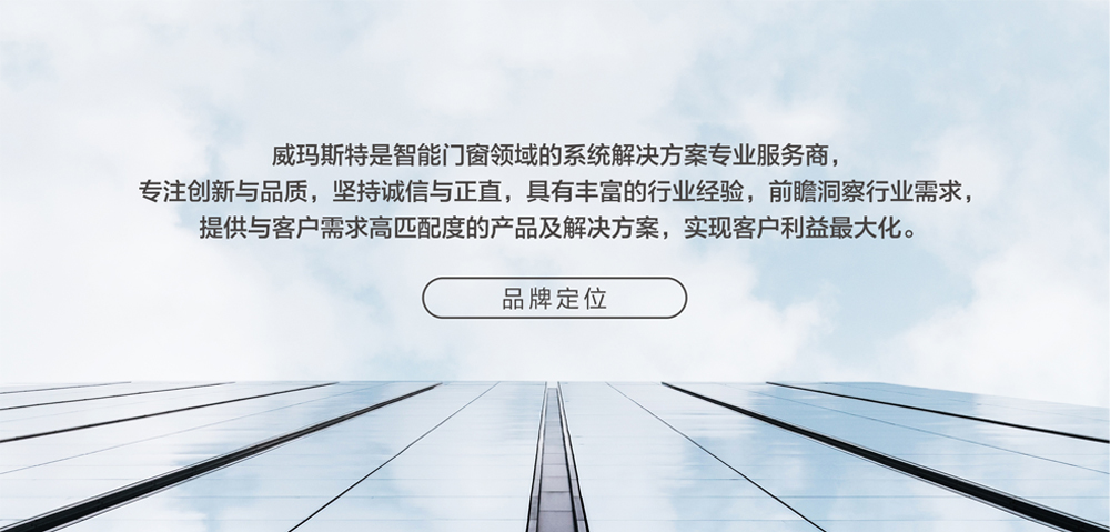 品牌定位:威瑪斯特是智能門窗領(lǐng)域的系統(tǒng)解決方案專業(yè)服務(wù)商,專注創(chuàng)新與品質(zhì),堅持誠信與正直,具有豐富的行業(yè)經(jīng)驗,前瞻洞察行業(yè)需求,提供與客戶需求高匹配度的產(chǎn)品及解決方案,實現(xiàn)客戶利益最大化。