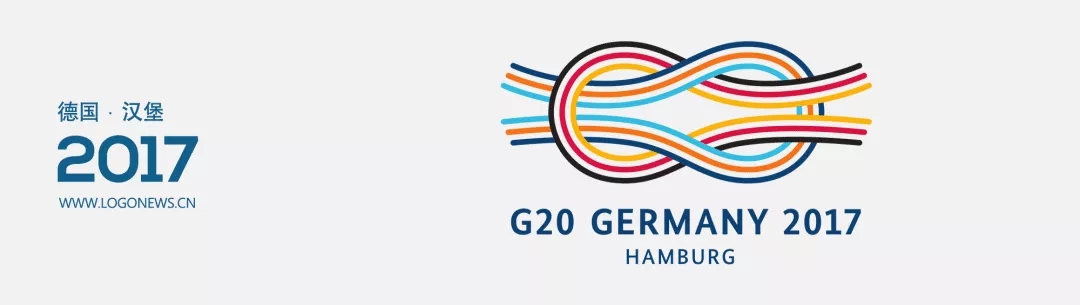 2017年德國漢堡G20峰會LOGO通過融合了德國國旗顏色的不同線條(代表各種問題)形成了一個兩端繞軸穿梭而成的「平結(jié)」,寓意世界的相互聯(lián)系更為密切。