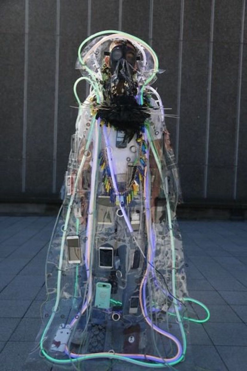來(lái)自葉錦添工作室的作品《手機(jī)》,是一件裝滿了各種各樣手機(jī)的衣服,在葉錦添眼里這件衣服是海洋的記憶。