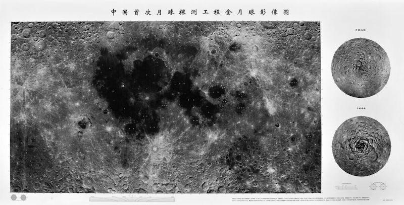 △探月與航天工程中心據(jù)嫦娥一號(hào)衛(wèi)星傳回的數(shù)據(jù)制作的全月球影像圖,圖片來(lái)源:中國(guó)國(guó)家博物館