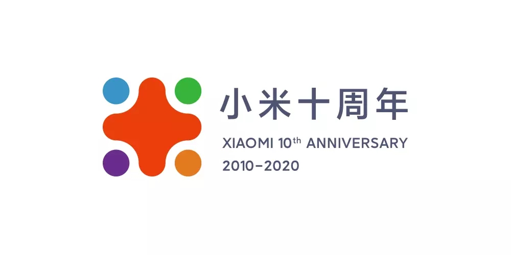 小米十周年Logo使用了一個(gè)非常多彩的米字,米中的十與四個(gè)小點(diǎn)顏色均不相同,突出了十周年這個(gè)主題。