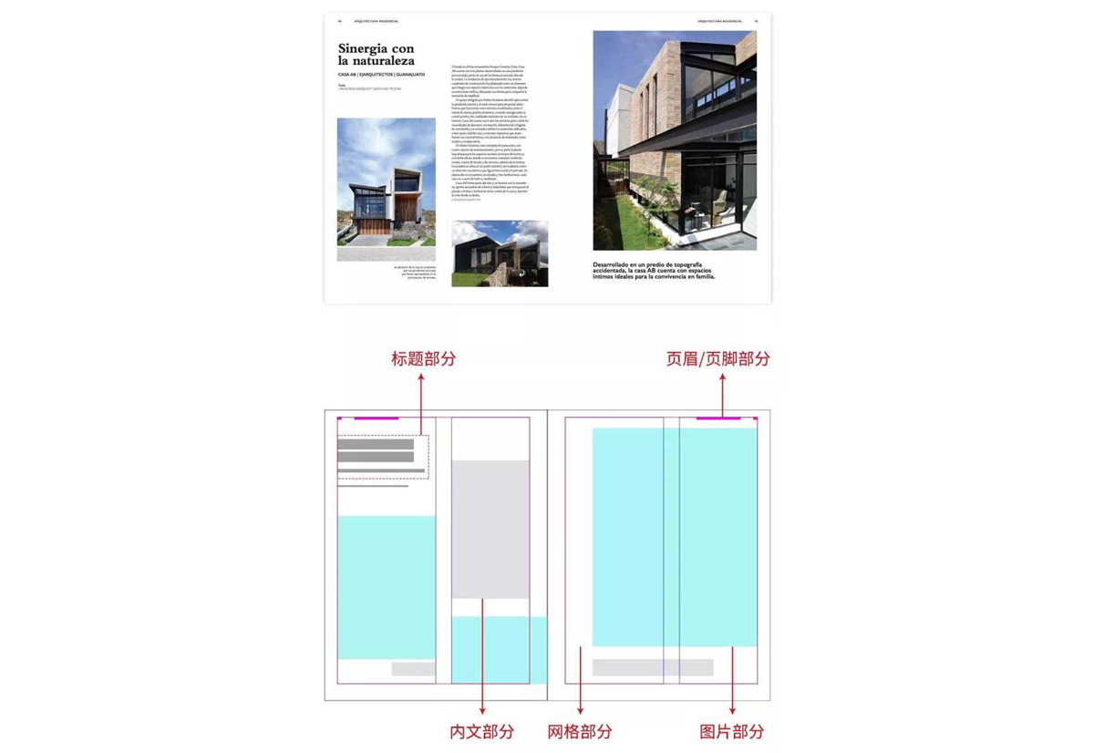 從版面中,我們能清晰看到主要由文字和圖片兩部分組成。文字編排部分劃分為:標(biāo)題編排、內(nèi)文編排、頁(yè)眉頁(yè)腳編排。其次是圖片處理和網(wǎng)格使用,如果想讓版面更加豐富層次,也會(huì)考慮添加點(diǎn)線元素和顏色的搭配。這就是一本畫冊(cè)或書籍雜志的內(nèi)頁(yè)設(shè)計(jì)組成的部分元素。從上圖可以看到,雖然頁(yè)眉設(shè)計(jì)的部分很少,但它卻能輔助整篇文章的點(diǎn)綴,視覺(jué)上起到線的作用,使整個(gè)畫冊(cè)起到統(tǒng)一整齊的效果。