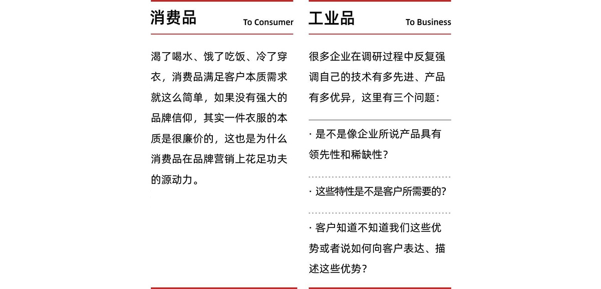 為了更好地理解和探索,我們將工業(yè)品與消費(fèi)品的品牌傳播做對(duì)比,從而來分析工業(yè)品品牌傳播的痛點(diǎn)。