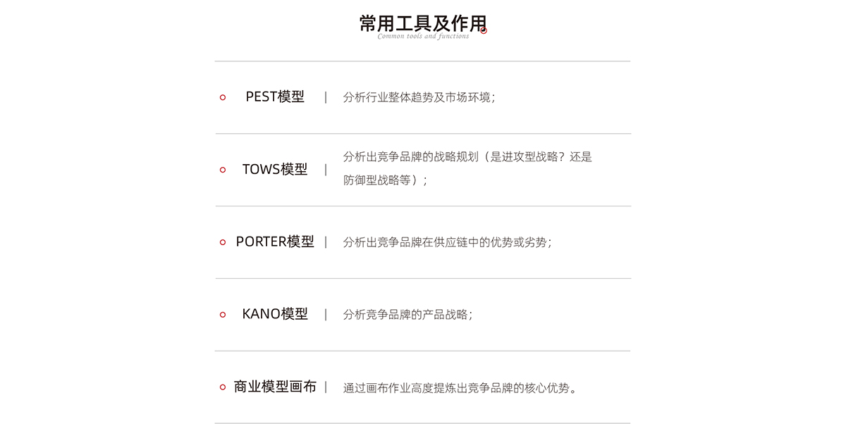 所以,我們在做競品調(diào)研總結(jié)報(bào)告時(shí)一般會(huì)采用閉環(huán)式總結(jié),給予結(jié)論供品牌主決策下一步的品牌戰(zhàn)略。常用工具及作用如下: