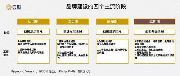 每個企業(yè)的品牌建設(shè)都能同樣劃分為四個階段:初創(chuàng)期、成長期、成熟期、維護(hù)期,每個階段的具體目標(biāo)和訴求都不相同。